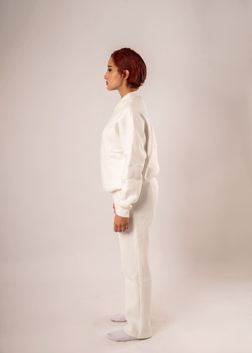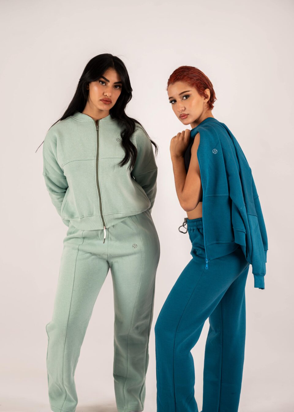 A premium stretch tracksuit featuring a fitted full-zip jacket and high-waist flared pants. Available in Black and Grey.