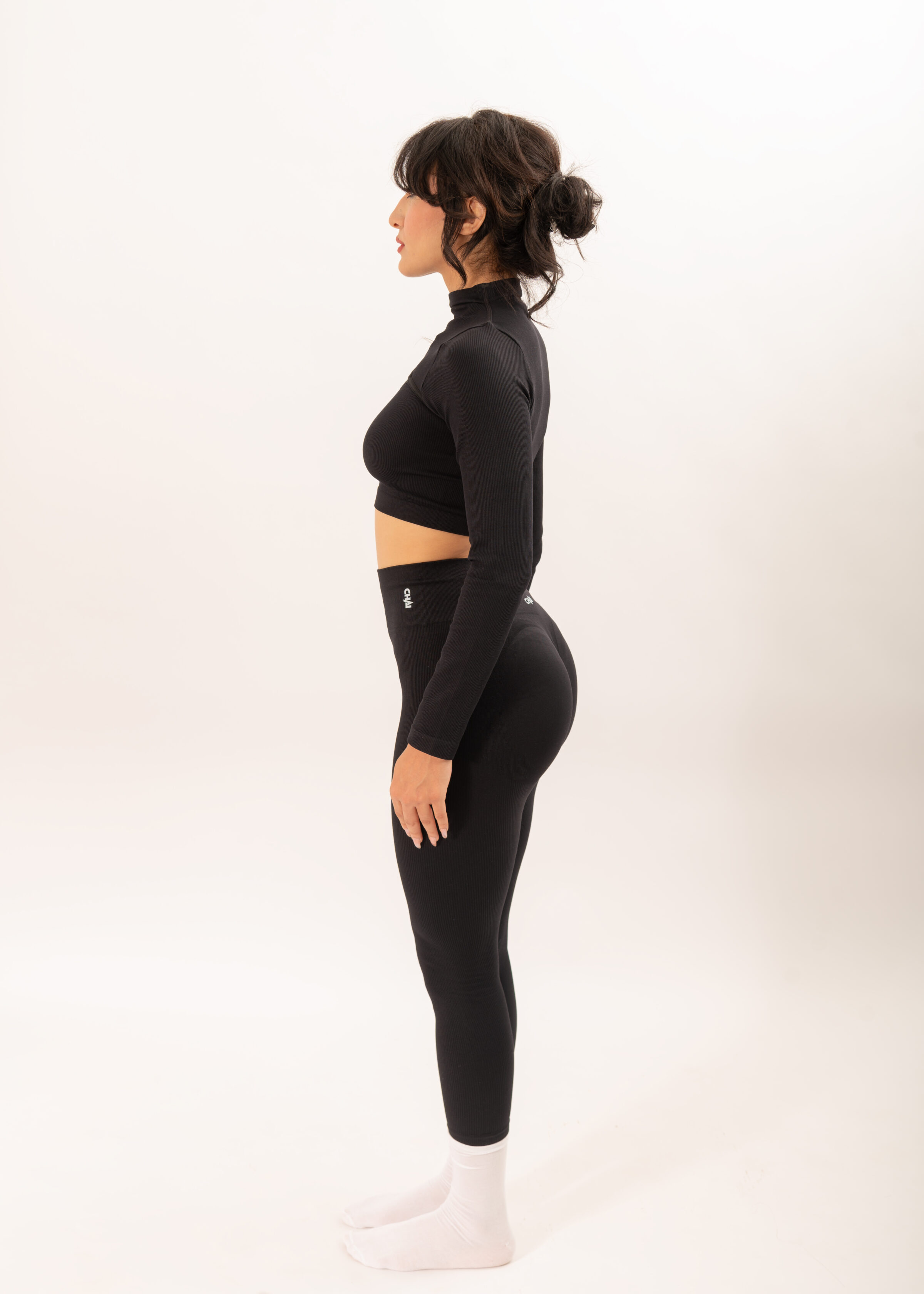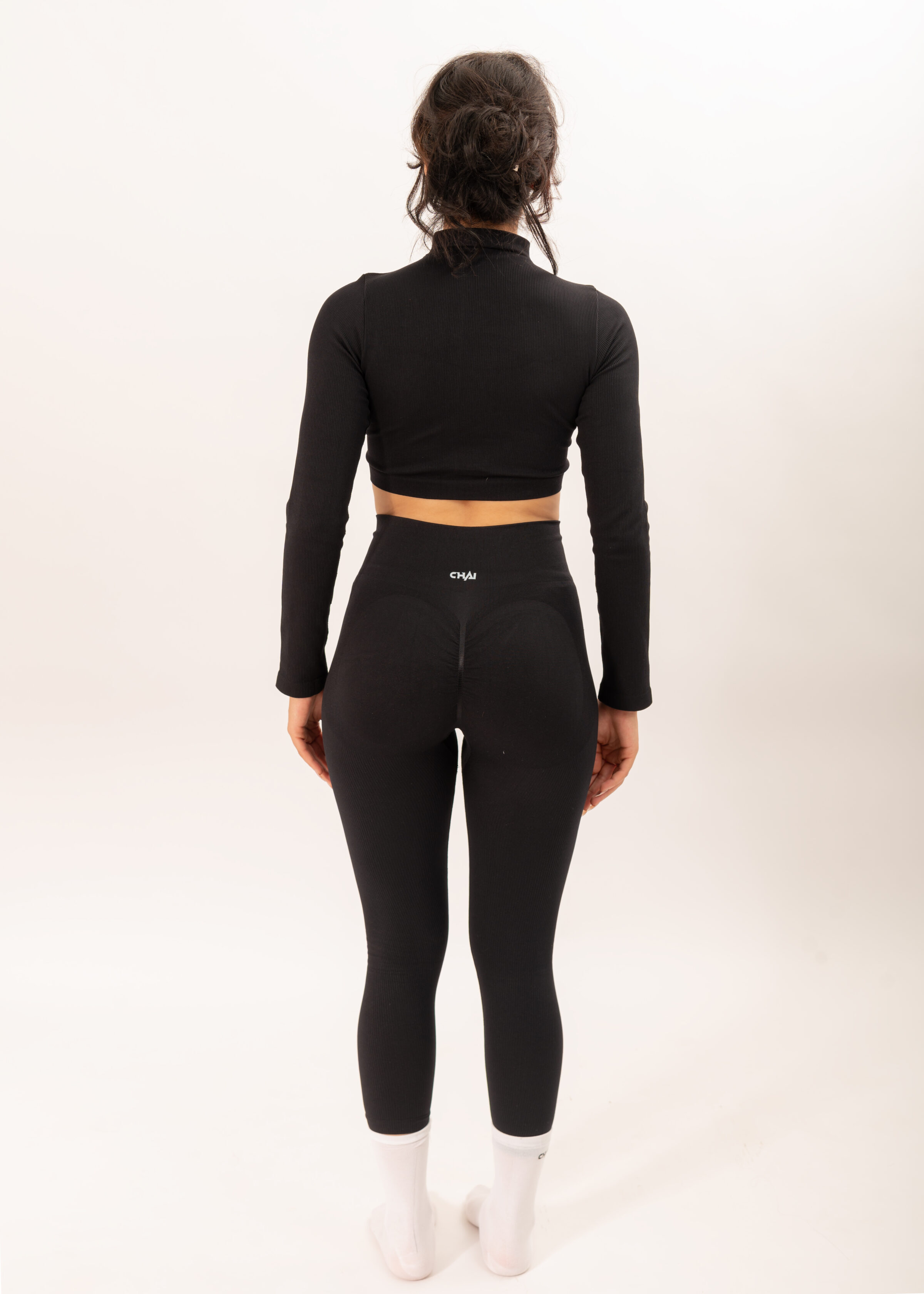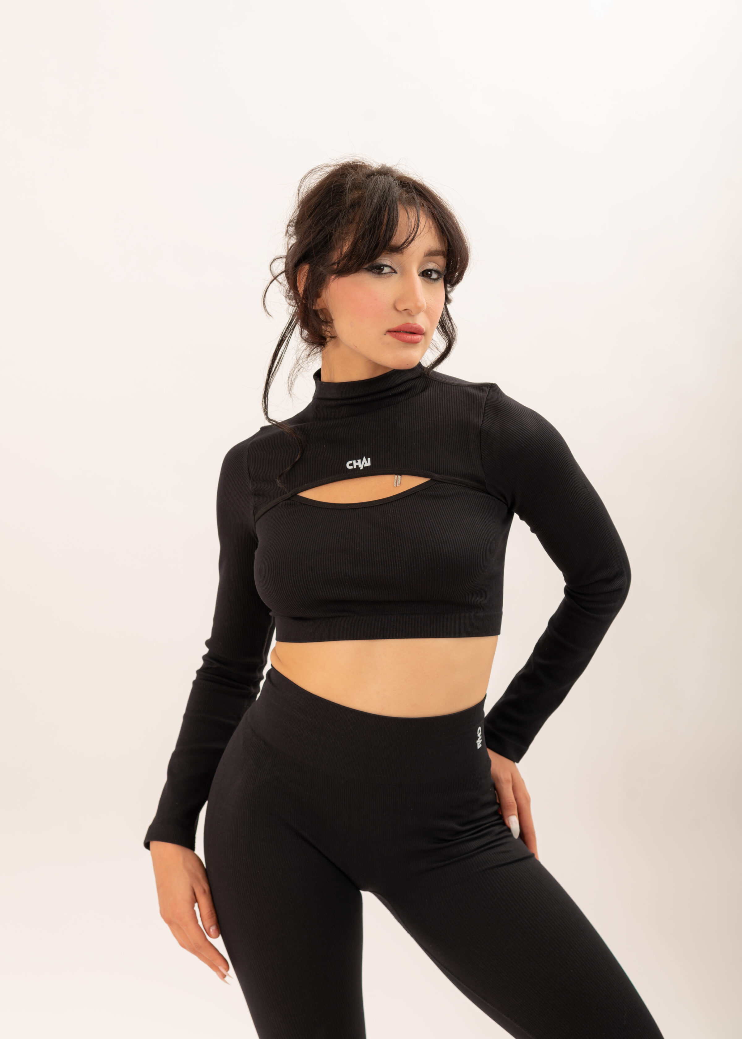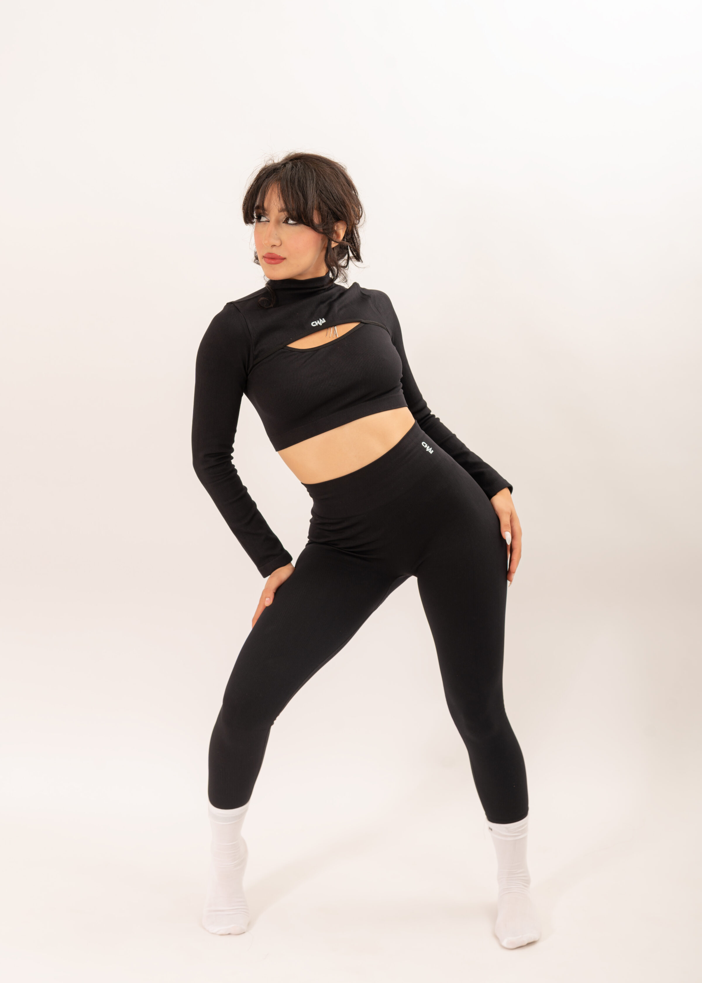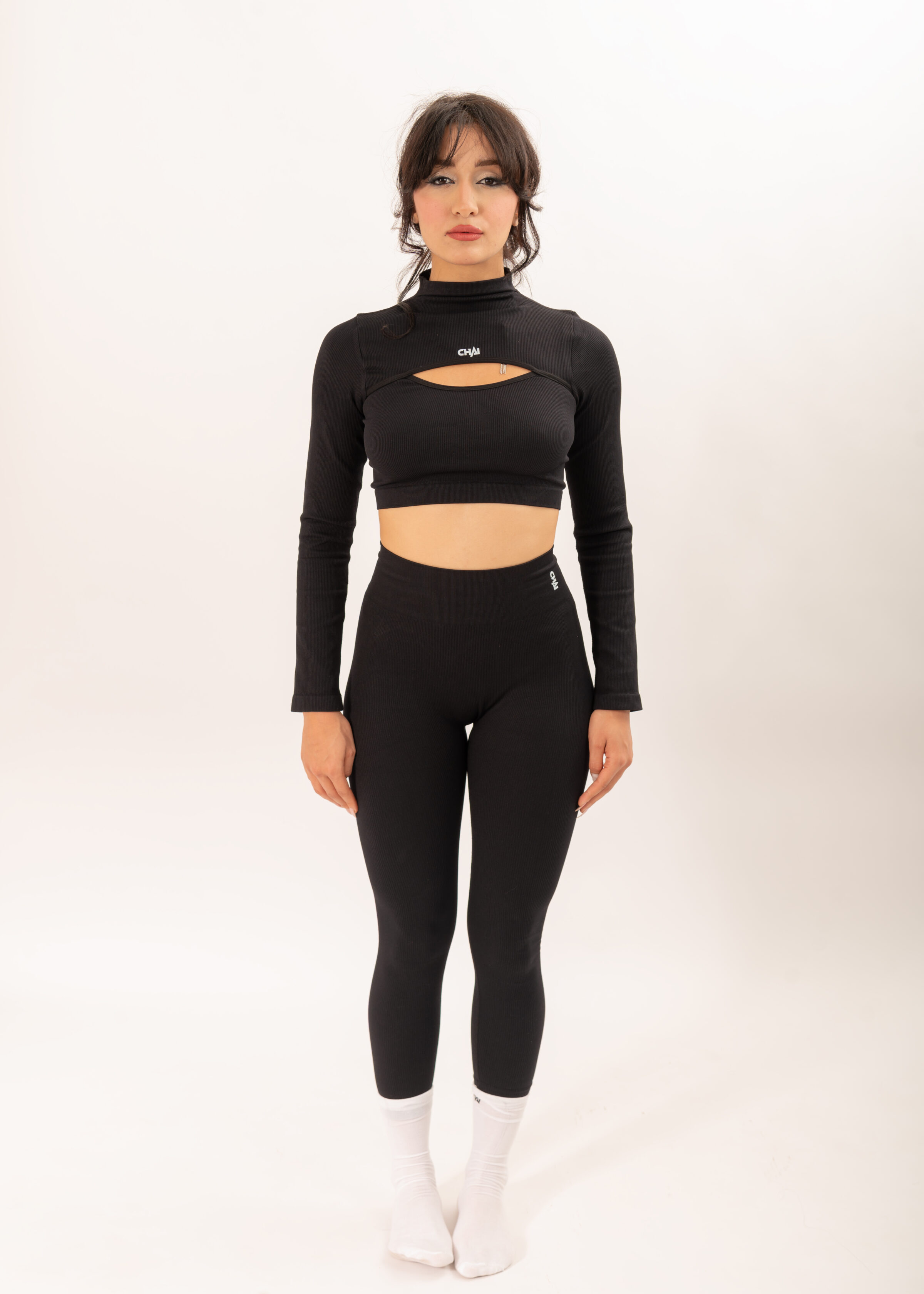 The long-sleeve crop top features a trendy front cut-out, while the high-waist leggings offer a sculpting, supportive fit that enhances comfort during any activity.