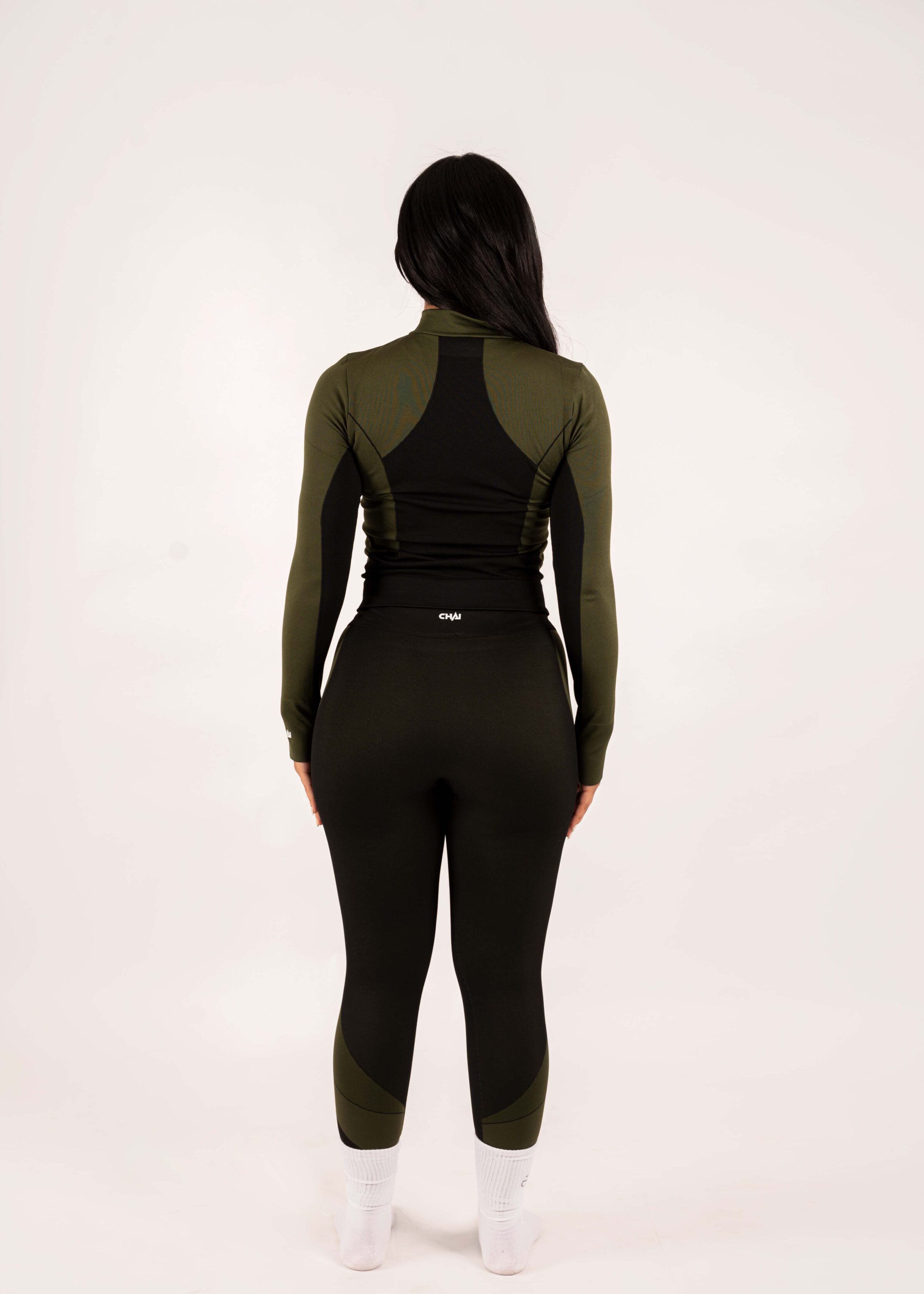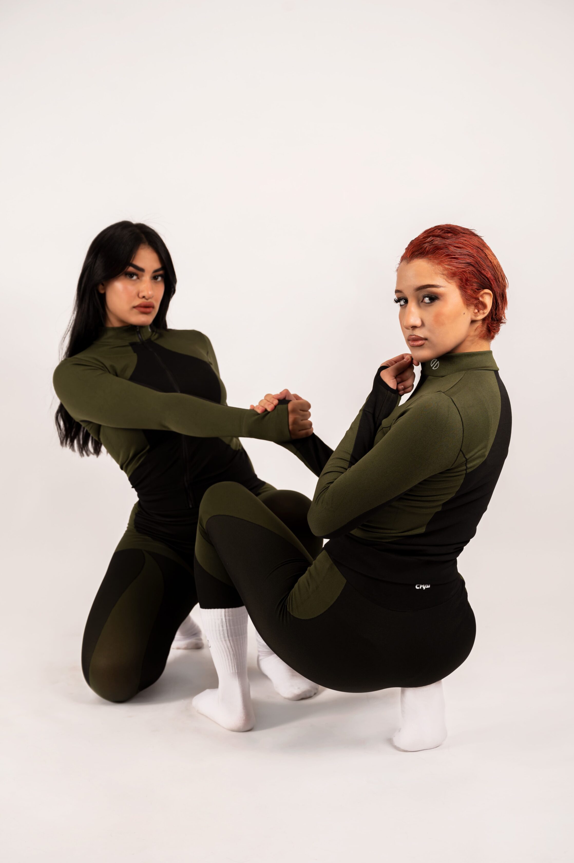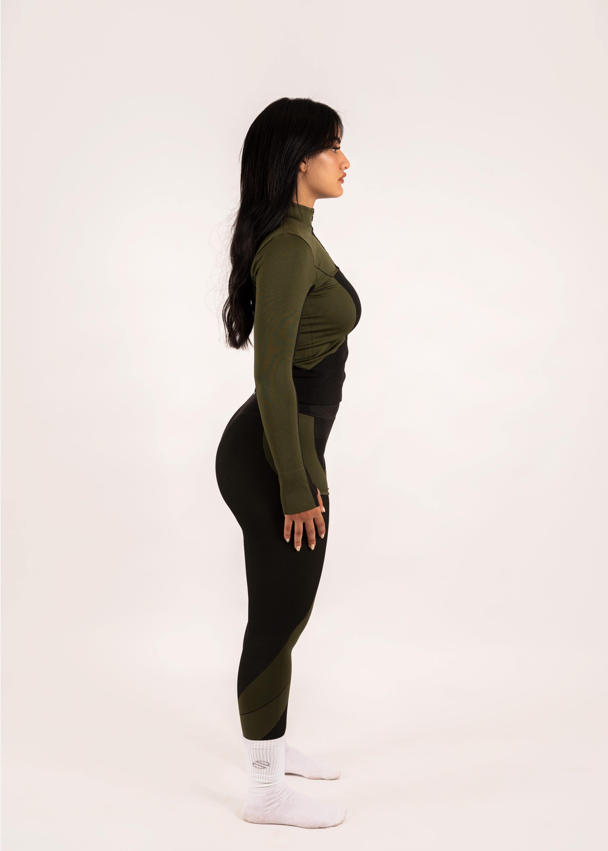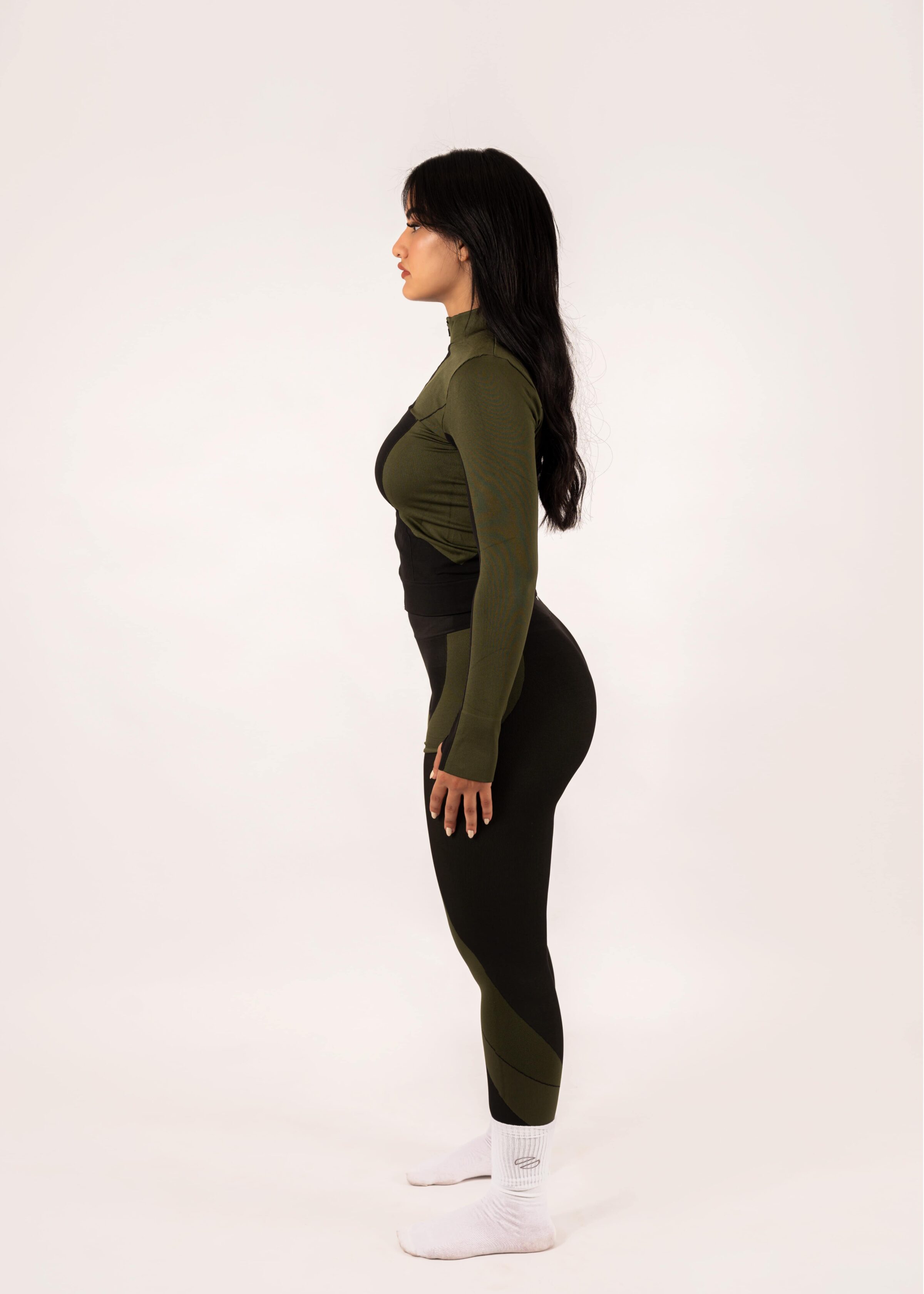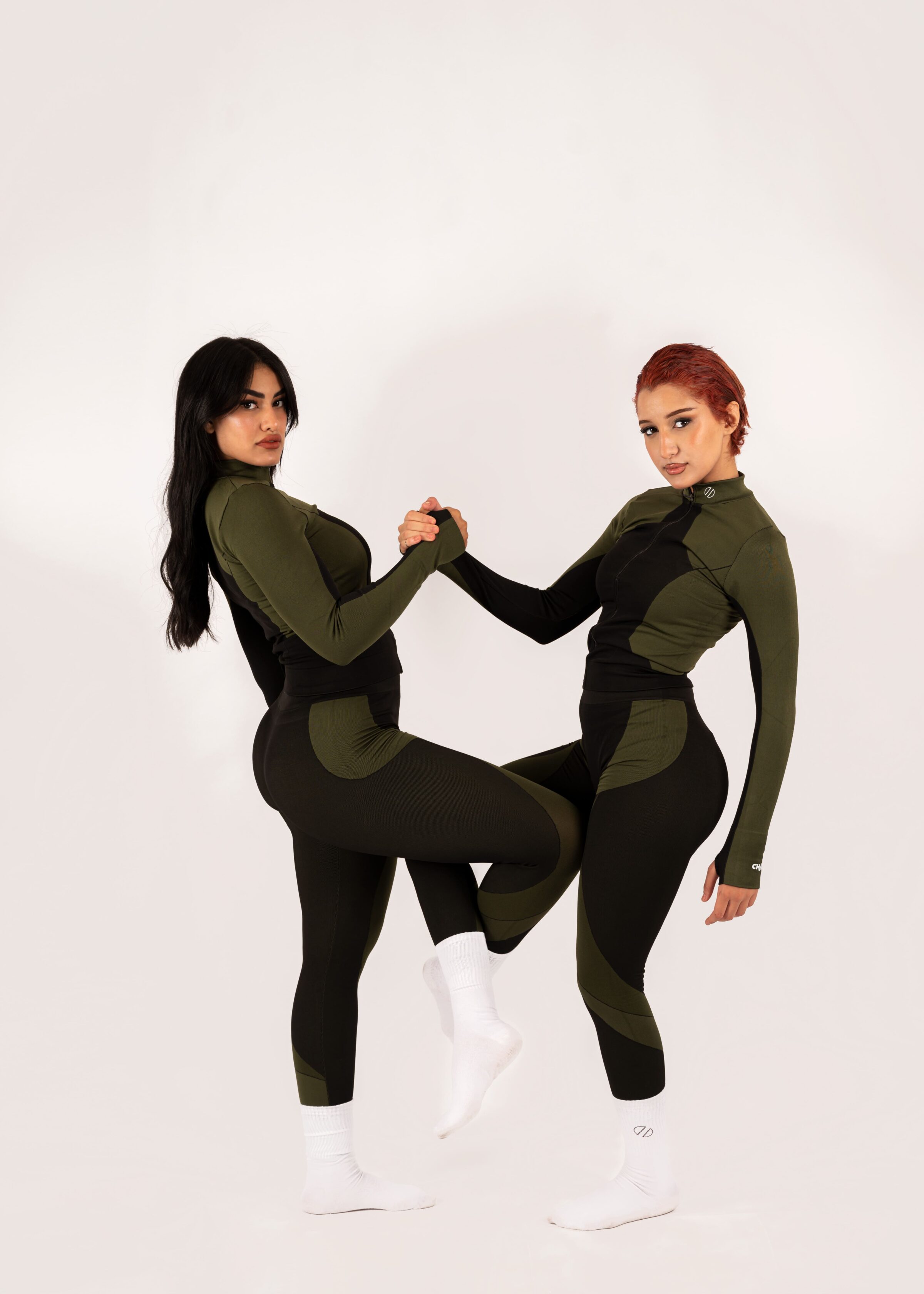The dynamic two-tone set is olive green and black and is crafted to elevate your workout experience.