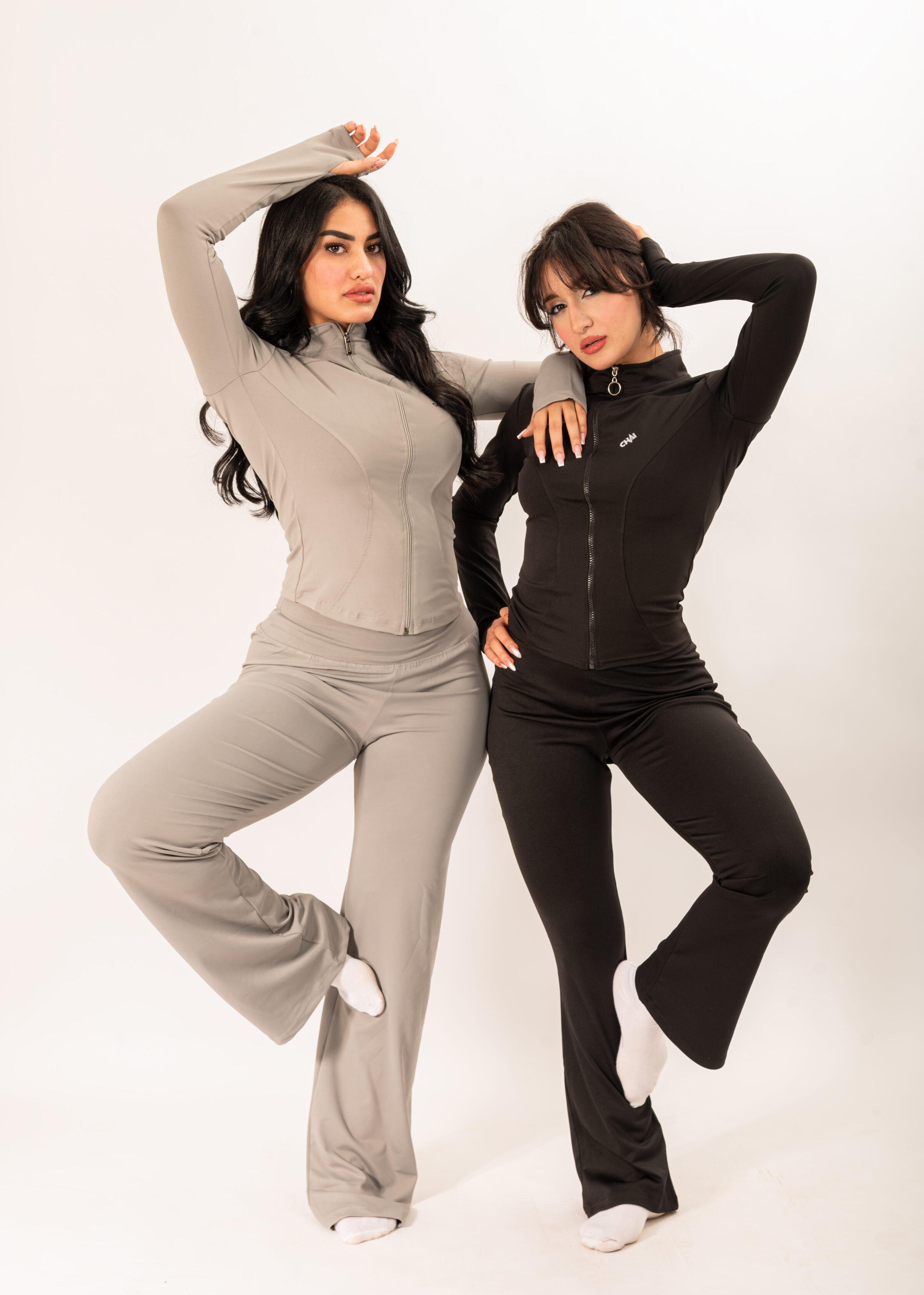 The slim-fit jacket features a high collar, contour stitching, and thumb holes, providing a sleek and sculpting silhouette. Paired with matching high-waist flared pants, this set offers both flexibility and style for training, casual wear, or athleisure fashion.